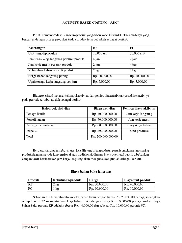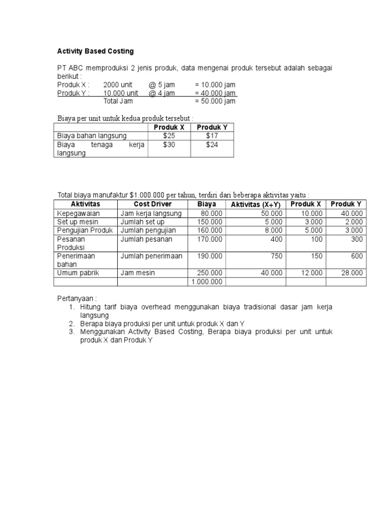 Yang metode manual komputer digunakan telekomunikasi contoh soal umum khusus total unit yang diproduksi 98.000 49.000 biaya bahan baku per unit $10 $15 total $980.000 $735.000 $1.715.000 tenaga kerja langsung jam per unit 1 2 total jam 98000 98000 total biaya($10 $980.000 $980.000 1.960.000 perjam) persiapan 40. Pembahasan activity based costing pembahasan activity based costing problem 14 3. Activity based costing (abc) digunakan untuk menentukan harga dan biaya, berikut penjelasan lengkapnya disertai contoh soal. Contoh soal 1 metode tradisional dan abc. Activity based costing pt abc memproduksi 2 jenis produk, data mengenai produk tersebut adalah