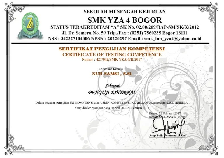 Lsp p1 dapat menerbitkan sertifikat kompetensi sesuai dengan skema yang telah divalidasi oleh bnsp. Contoh laporan uji kompetensi keahlian ukk smk terbaru demikian ulasan yang bisa saya sampaikan kali ini semoga bermanfaat khususnya bagi saya pribadi umumnya bagi sahabat semua. Dalam contoh sertifikat uji kompetensi keahlian smk, gawe cv telah memilihkan tema atau template yang terbaik untuk dijadikan inspirasi, ide ataupun acuan dalam penulisan surat anda. Dalam pelaksanaannya, bnsp memberikan lisensi kepada lsp untuk melaksanakan sertifikasi kompetensi. ujian melalui sistem sertifikasi mitra dudika atau asosiasi profesi: